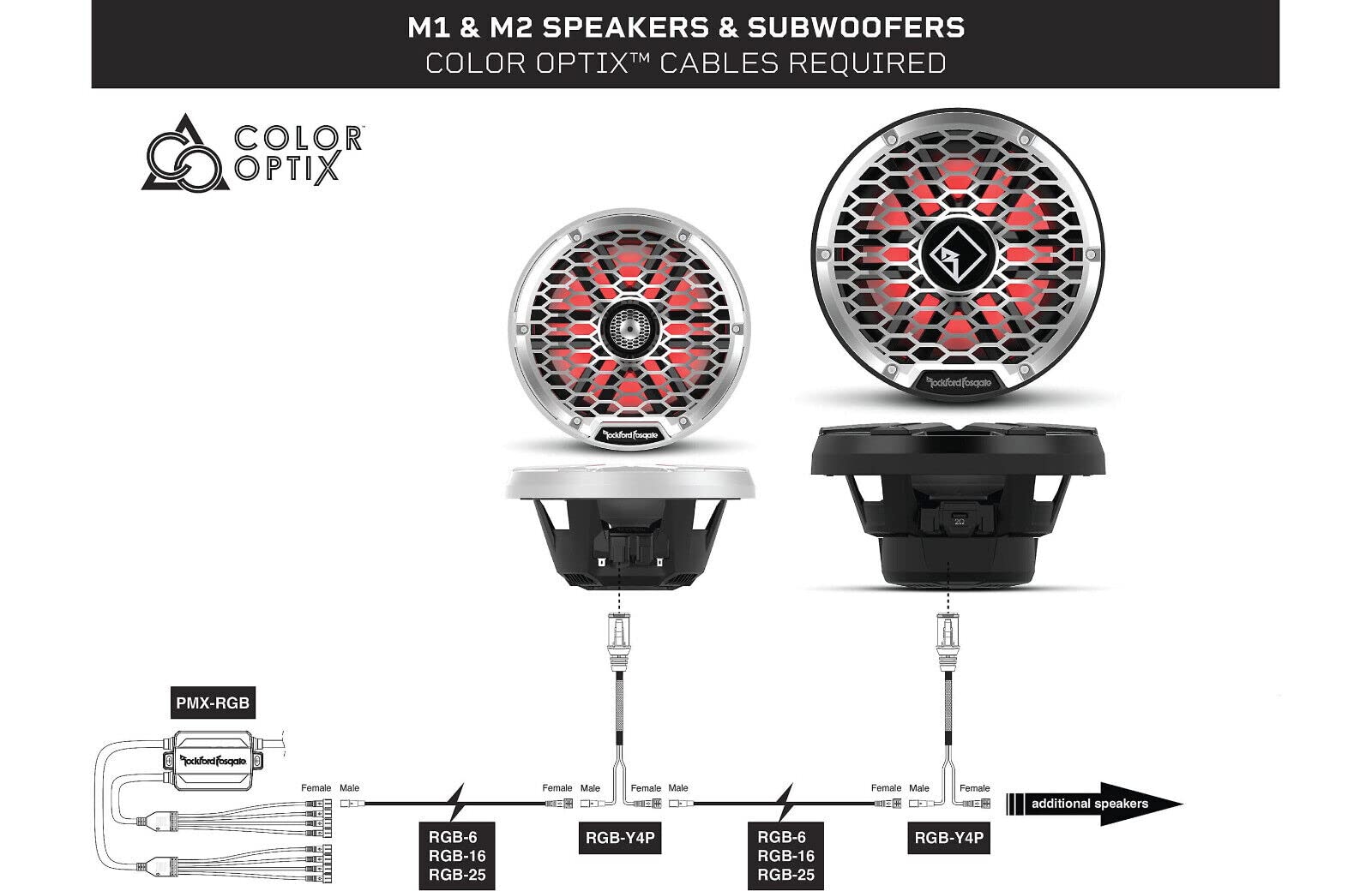 - Color Optix cables provide a water-tight seal for electrical connections between our Rockford Fosgate PMX-RGB controller and matching Color Optix M1/M2 speaker or subwoofer